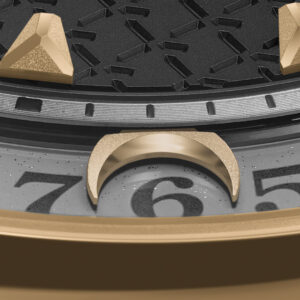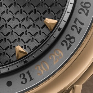 Its true innovation, however, is revealed along the outer edge of the dial. A fixed ring numbered from 1 to 31 frames the display, while a subtle crescent-shaped indicator moves gradually along the ring to mark the current date.