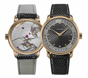 Through the caseback, the movement reveals finishing details inspired by the landscape of the brand’s home region. The bridges echo the curves of the Neuchâtel lakeshore, while the mainplate is decorated with Krayon’s signature wave finishing.