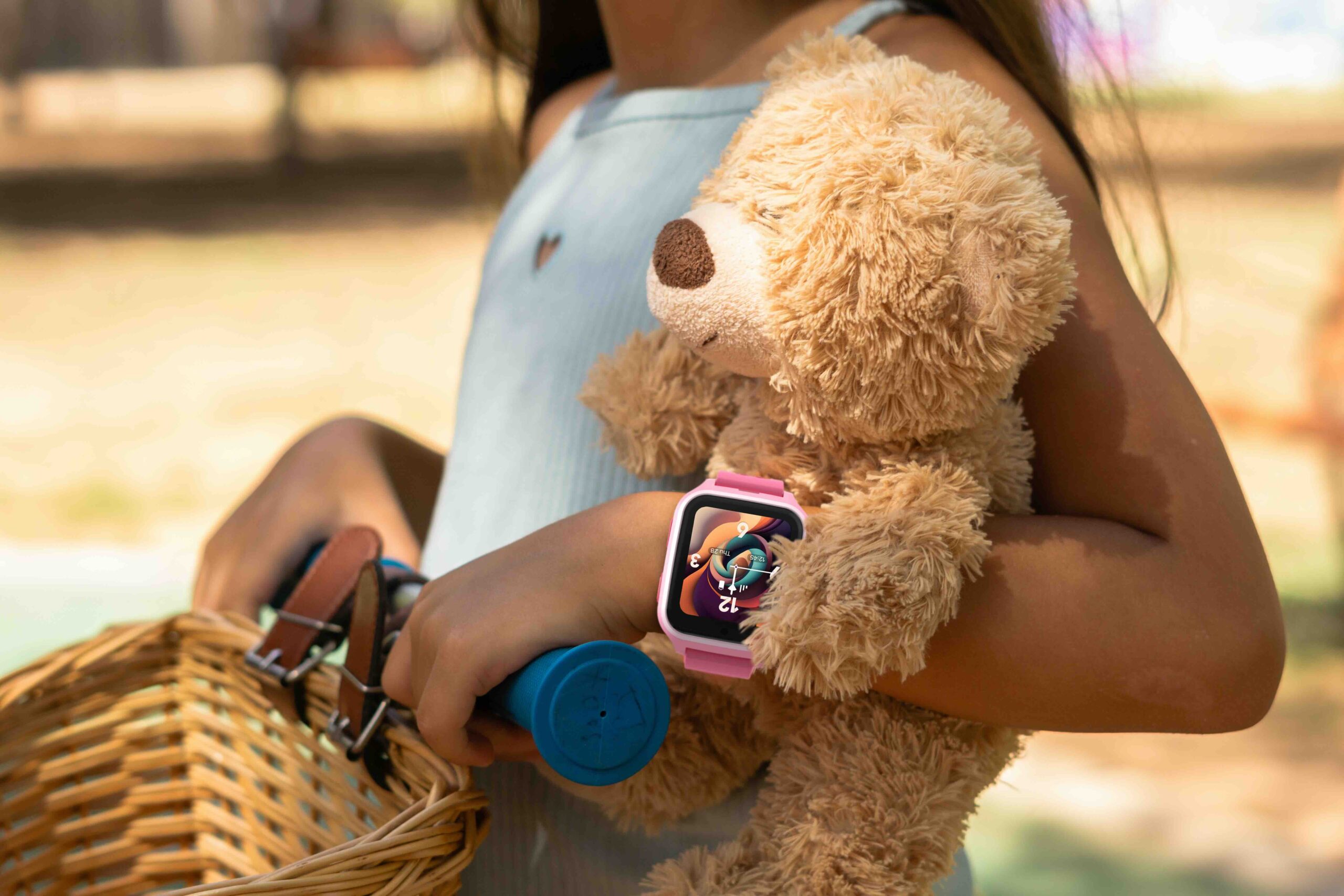 Girl riding a scooter while holding her teddy bear and wearing a smartwatch